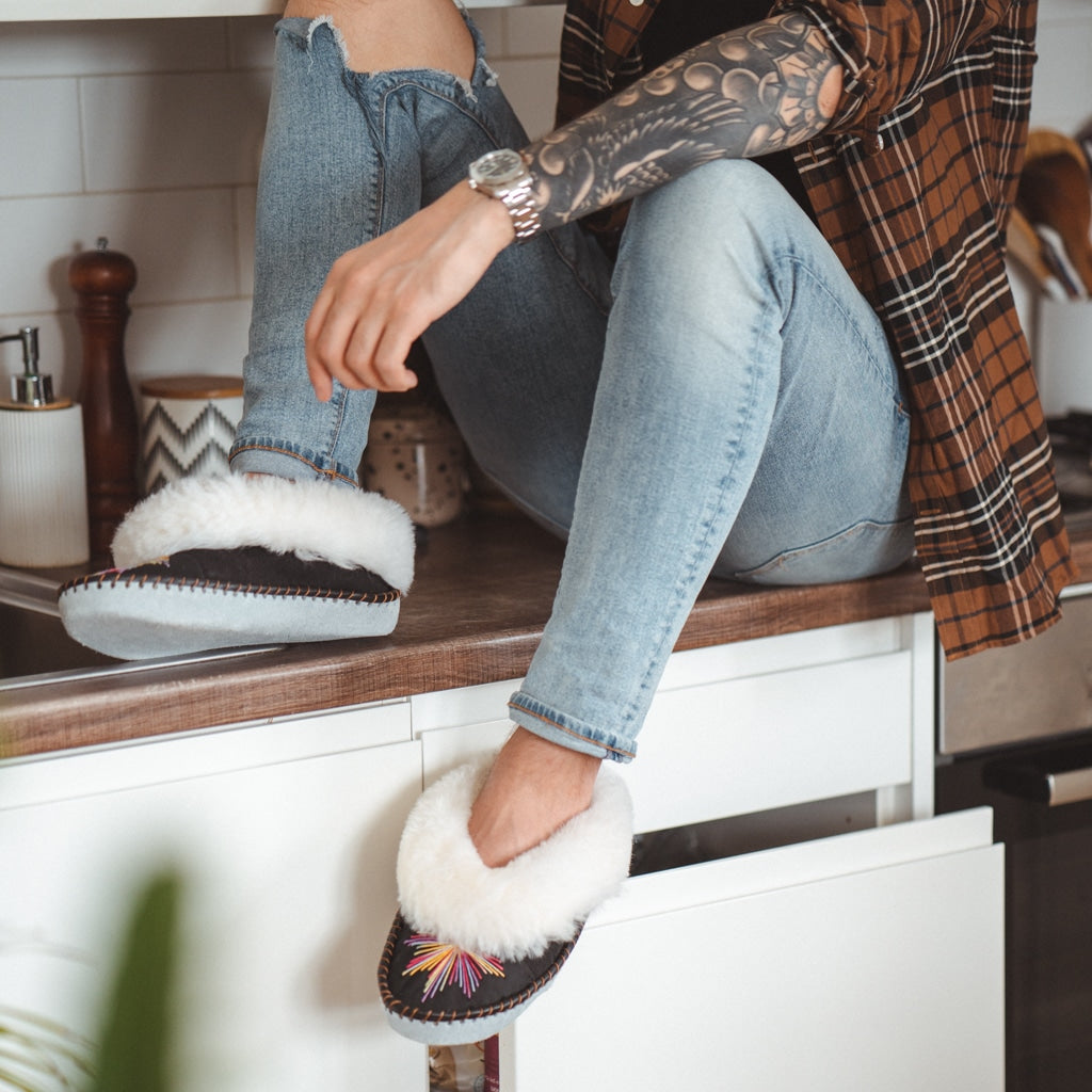 Our traditional handmade slippers are made from 100% natural sheepskin and display a soft woollen interior and white fluffy sheepskin cuff. Our Men's Rainbow Sheepers feature a beautifully matte black upper with rainbow embroidery.