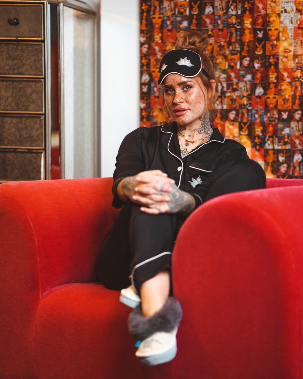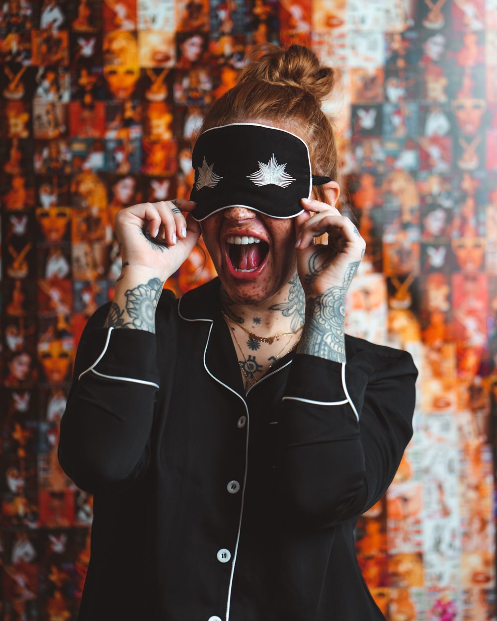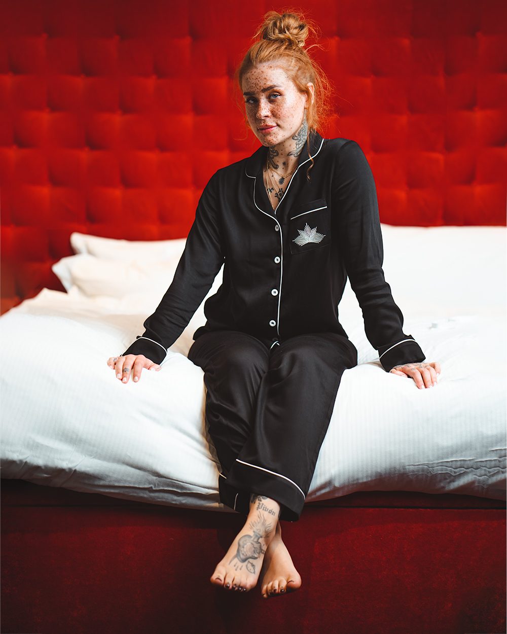 This classic black square-hemmed pyjama shirt with white piping pyjamas made with elegant white embroidery.