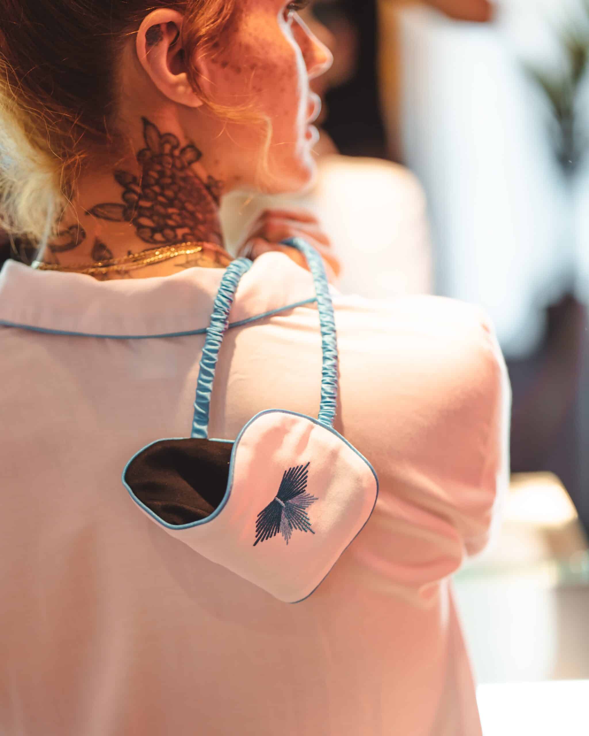 Each mask has its own matching embroidered and ribboned drawstring pouch to keep it clean and safely stashed in your bag.