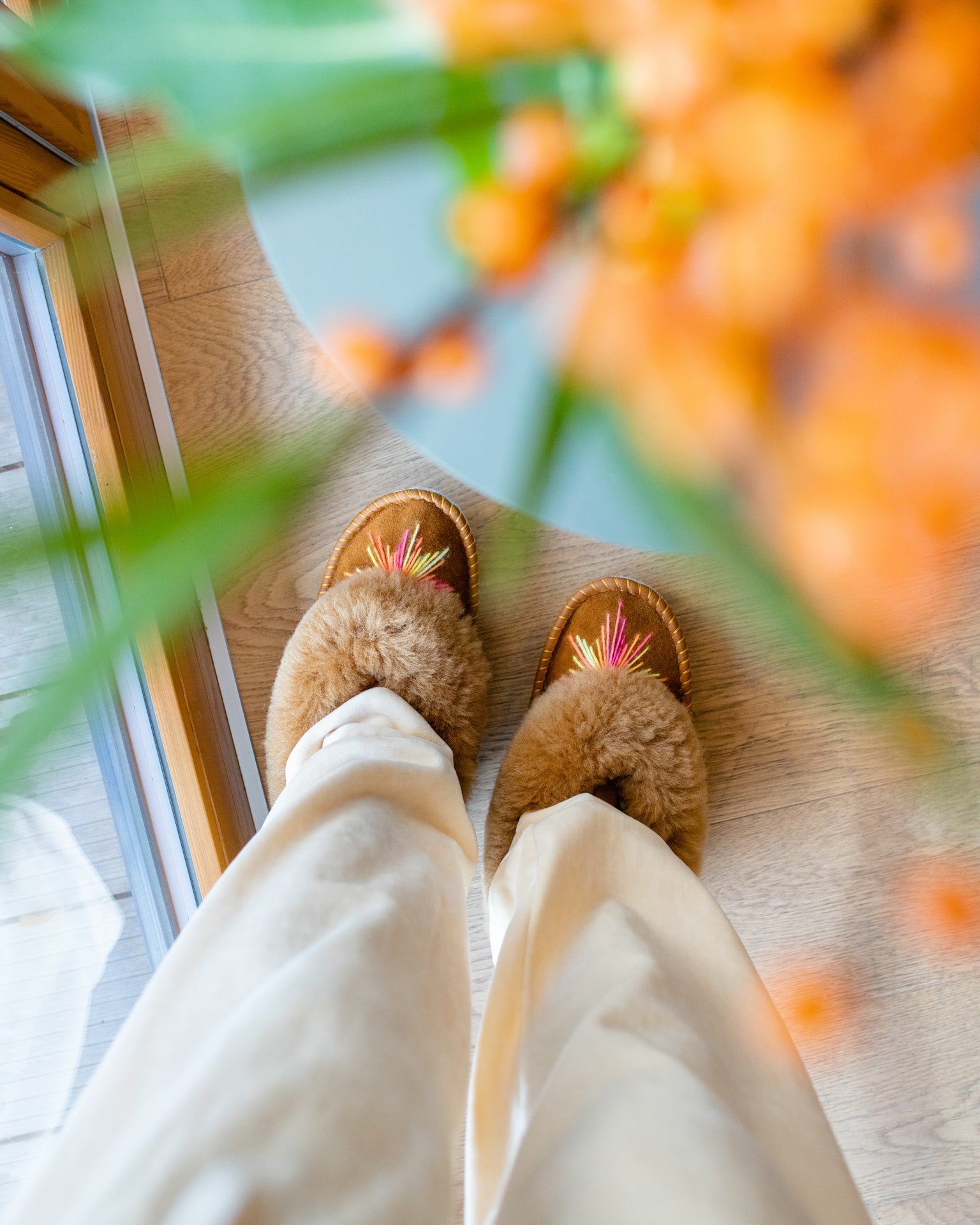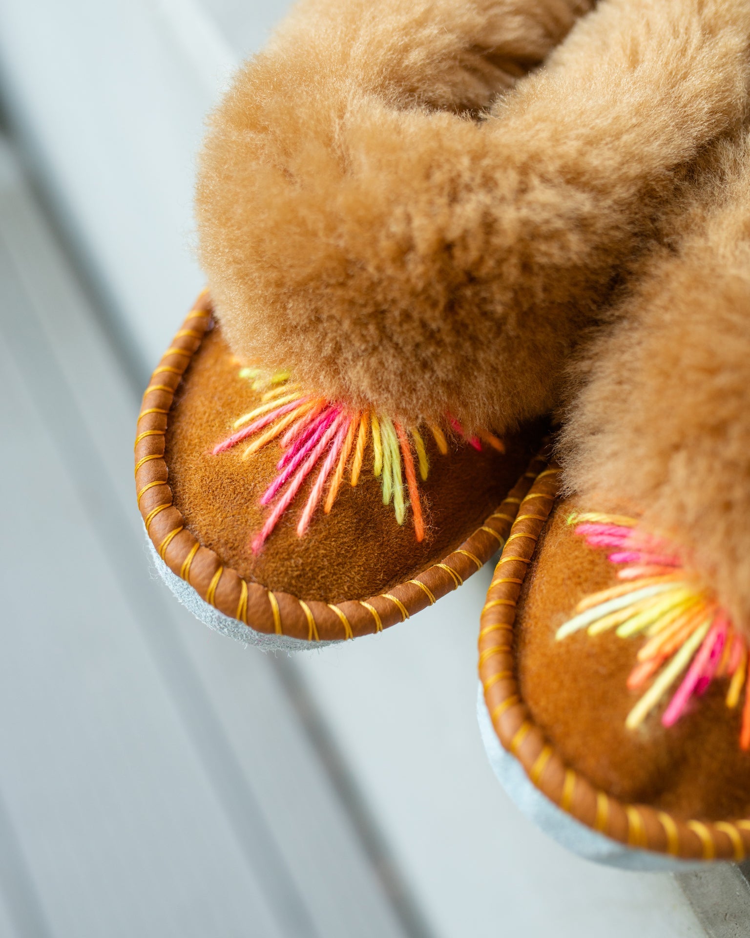 Meet the Fudge Sheepers - cosy, stylish and oh-so comfortable. Made from 100% sheepskin and with sustainability in mind, Fudge offers a modern take on a timeless style. Handmade and lined with unbeatably soft sheepskin, the tan upper is upgraded with orange and pink calypso tones for a playful yet subtle finish. Perfect for those work from home days, Fudge Sheepers slippers will be your go-to for everyday comfort.