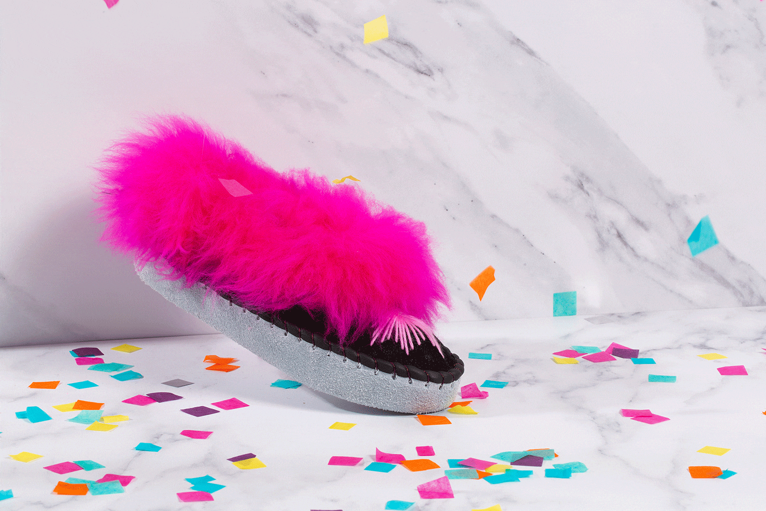 With a neon pink fluffy sheepskin cuff, the contrasting black upper is complete with our signature starburst embroidered motif.