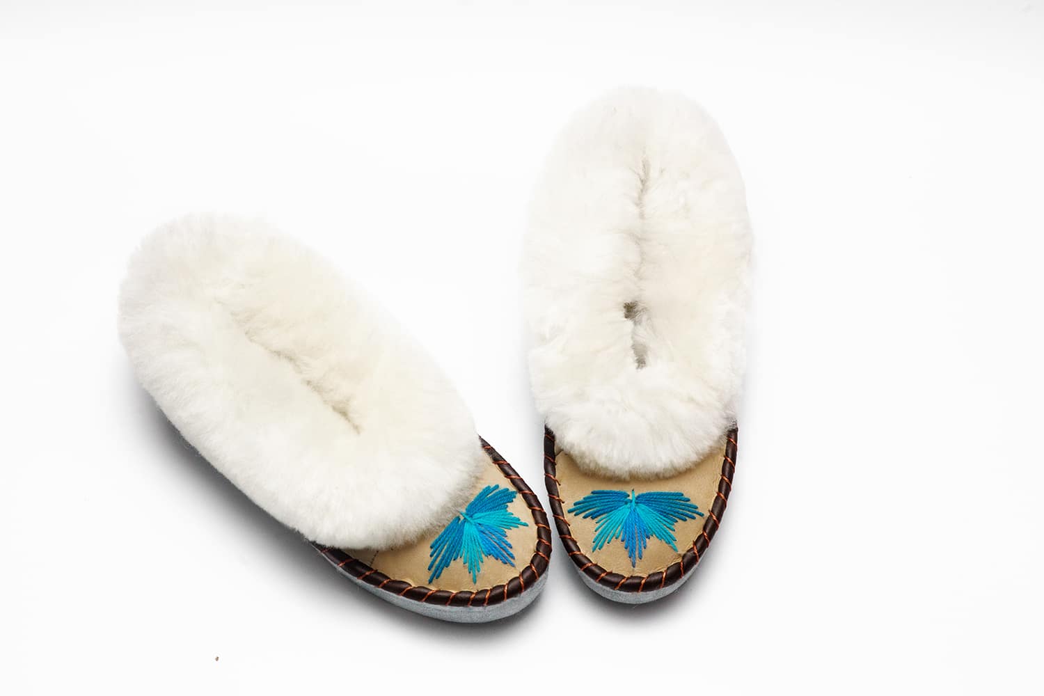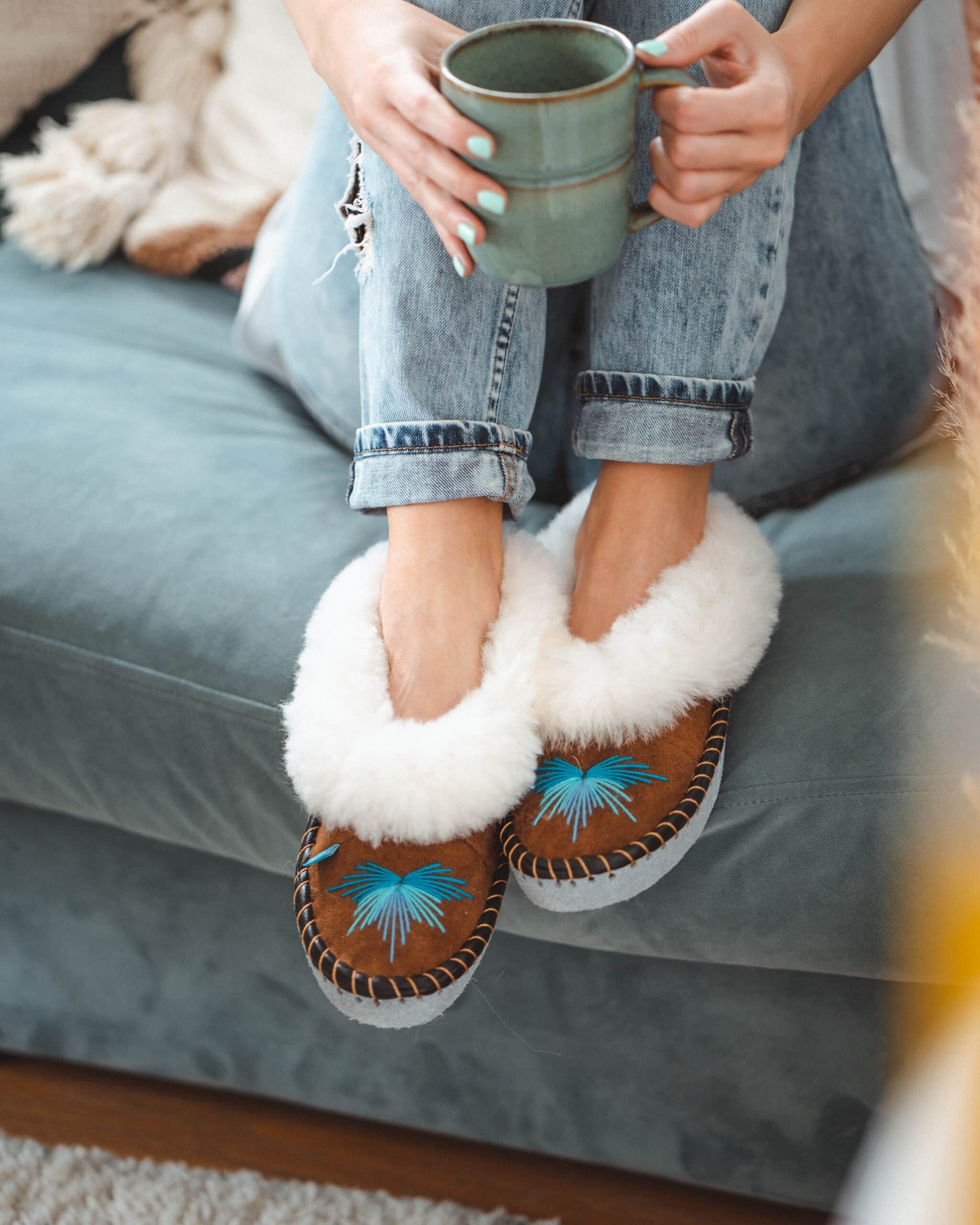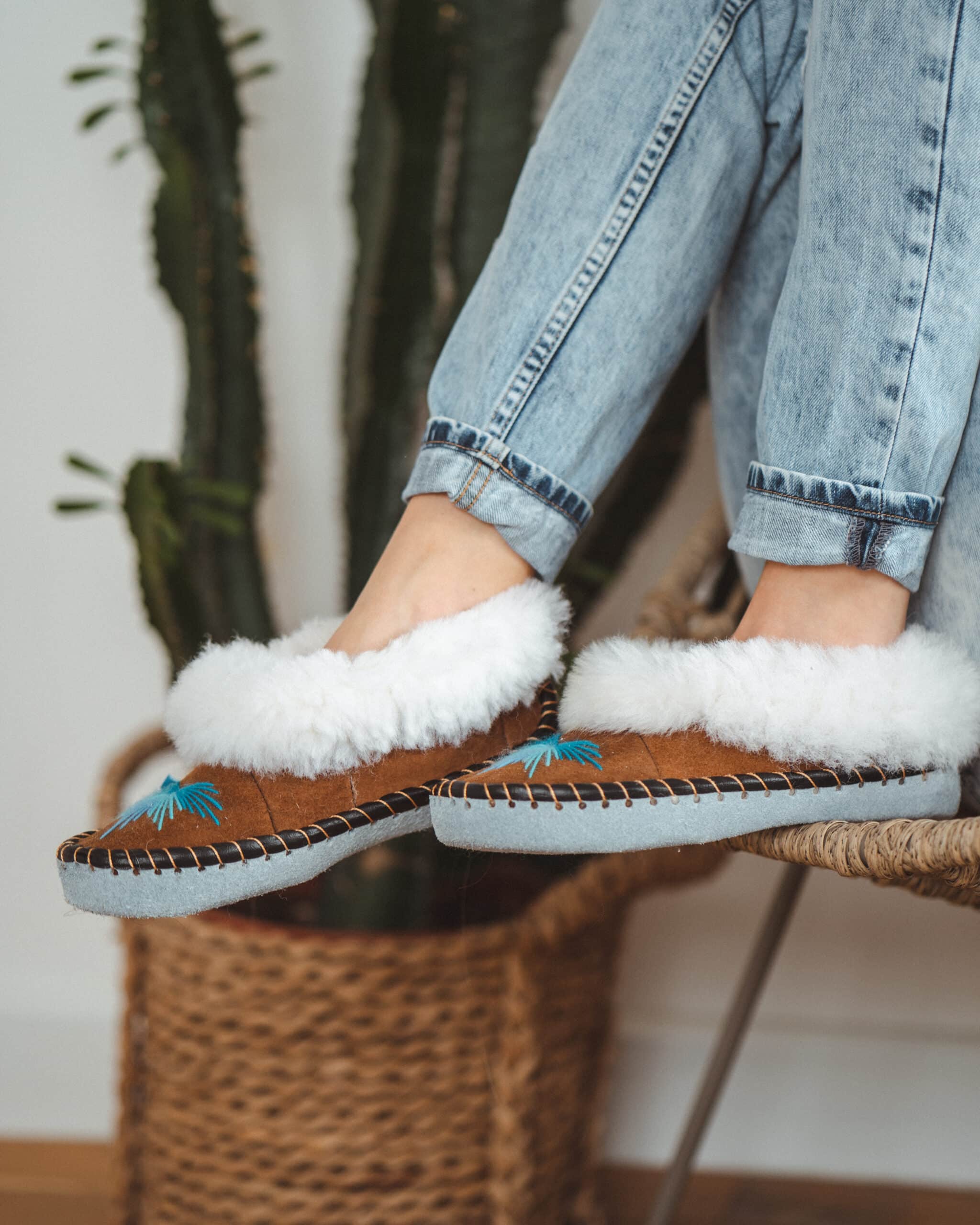 Beautifully vibrant and handmade, these best-selling moccasin sheepskin slippers are the perfect necessity for your cosy days in.