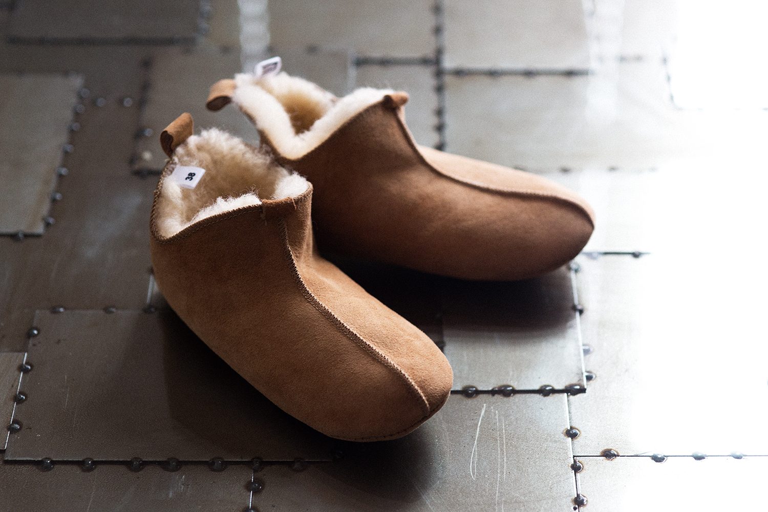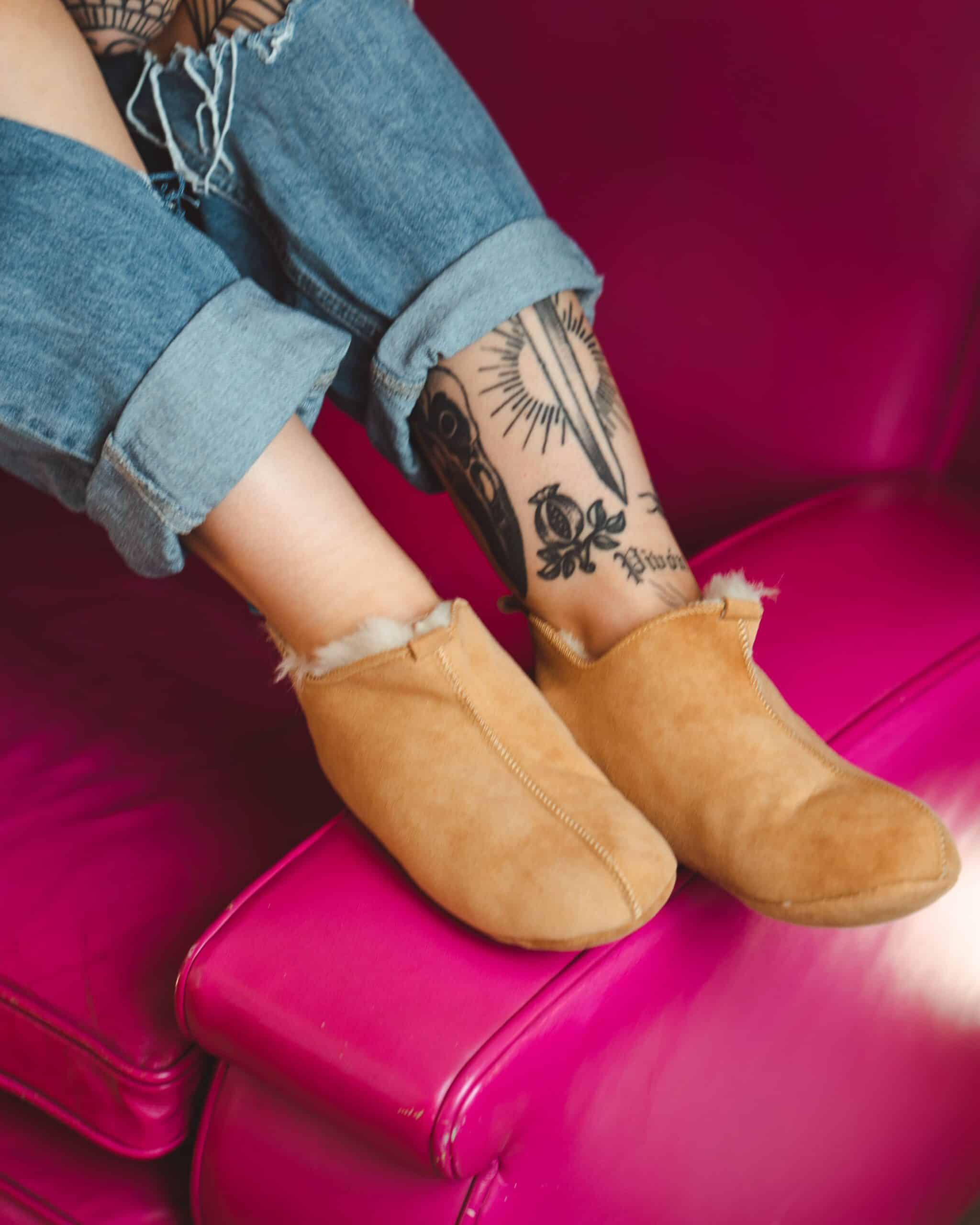 The pixie boots are soft sheepskin slippers for women in the colour chestnut.